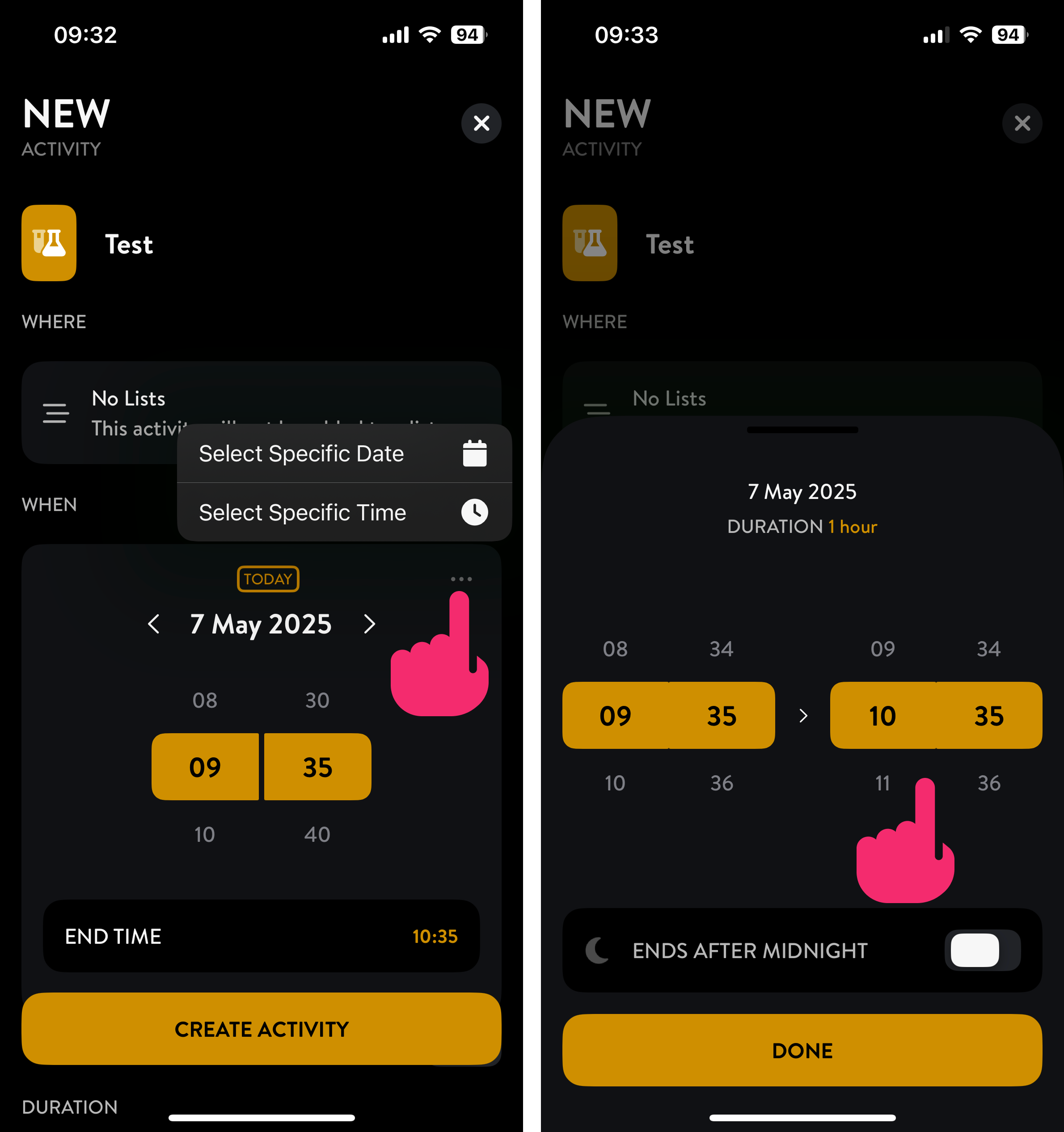 To choose a specific start or end time for an activity: